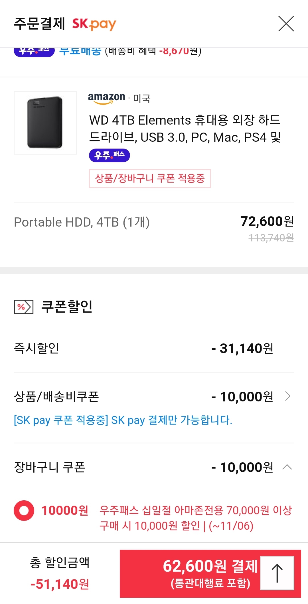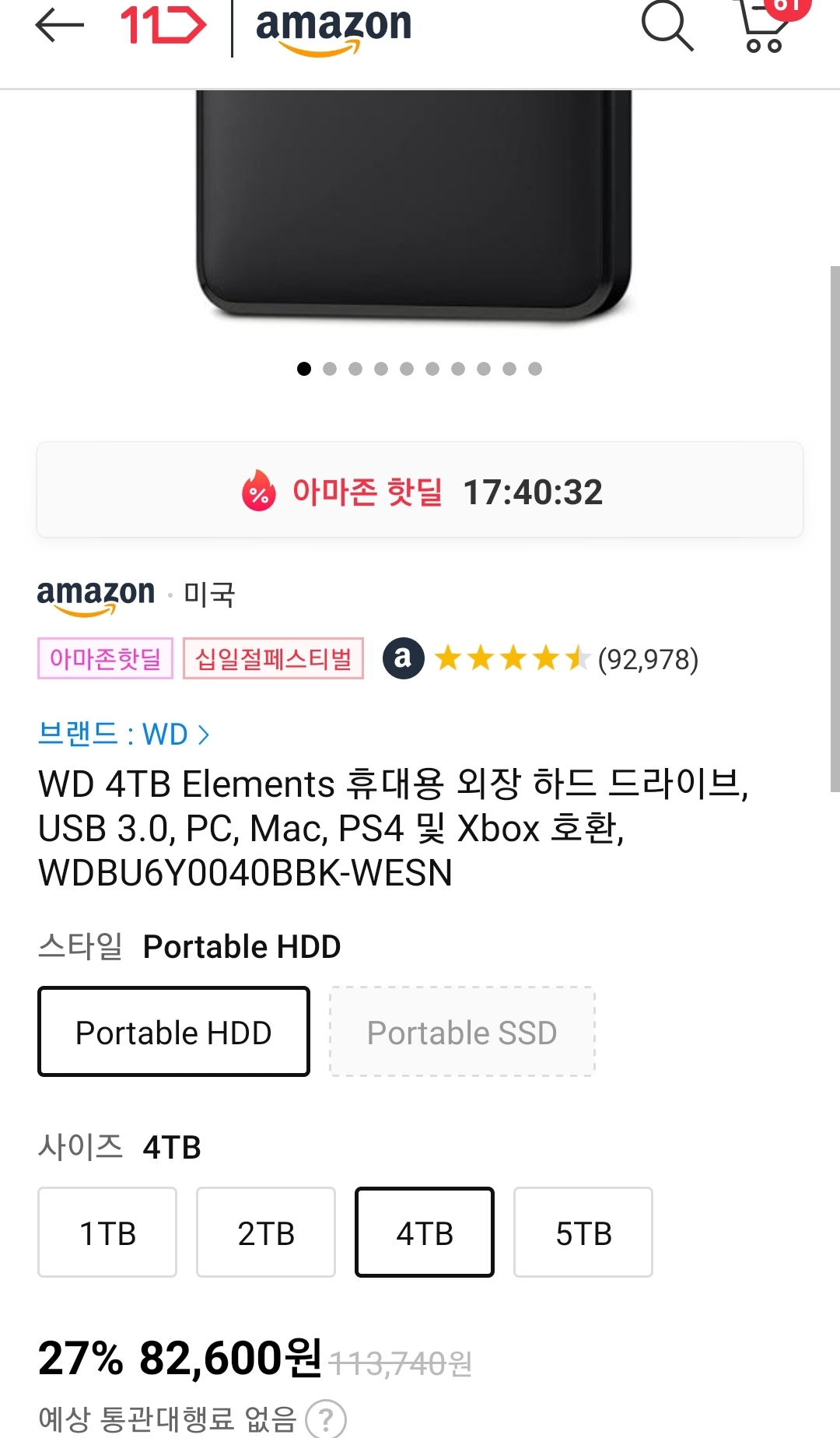 (11번가-아마존) WD 4TB 2.5"(usb 3.0) 엘레멘츠 외장하드(8.2만 → 7.2만/최대 6.2만) 본문
