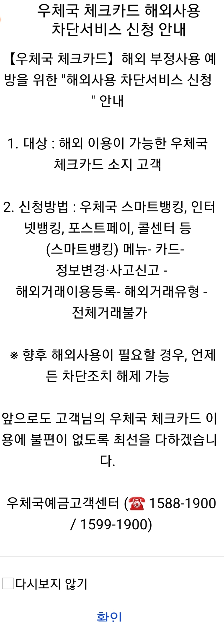 우체국 체크카드 해외사용 차단서비스 본문
