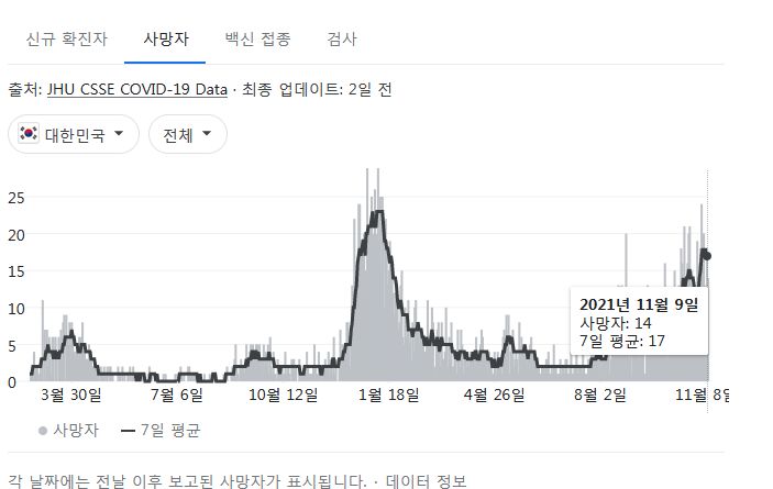 | 코로나19, 주간 발생동향(유행) 분석(2021.11.9.~11.10.기준)/:/ 병상, 변이주 분석은 없음. 이동량분석, 확진자 연령대별 분석 등 (0) | 2021.11.10 |