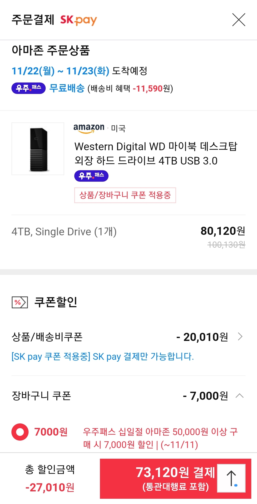 우주패스가입자는 7천원 장바구니 쿠폰을 적용할 수 있고, 11번가 신한카드 1만원 할인쿠폰을 아직 안 썼다면 그것도 적용가능합니다.