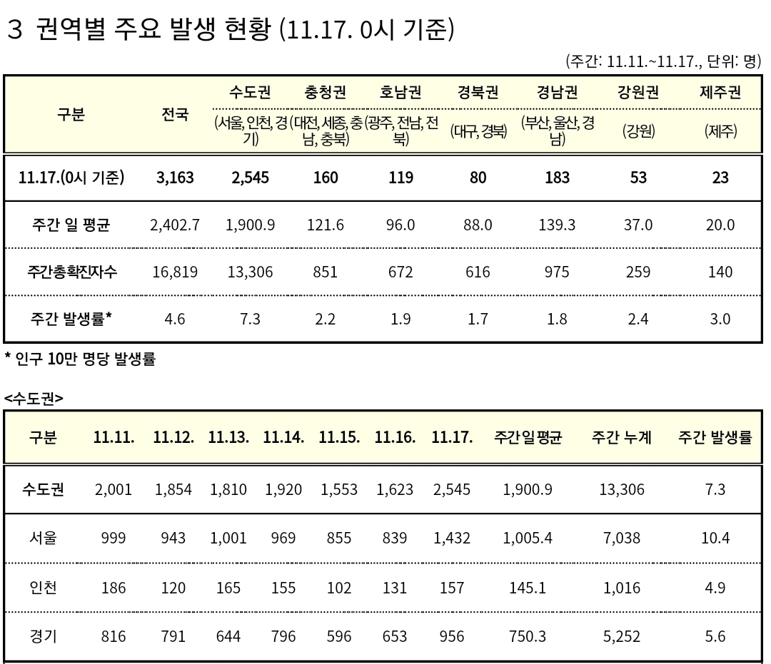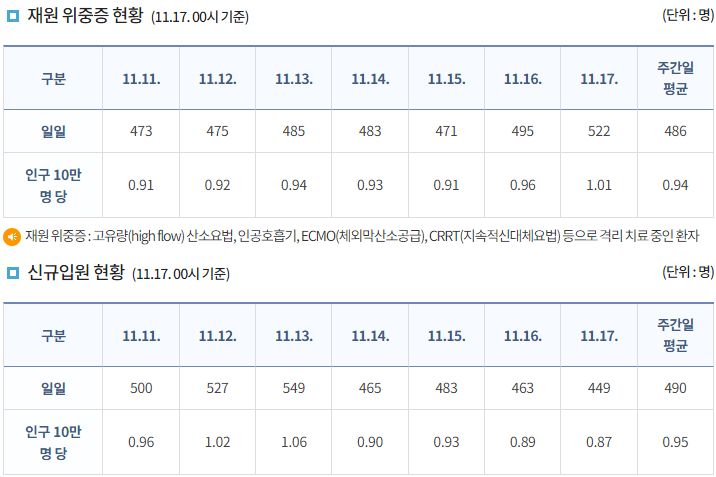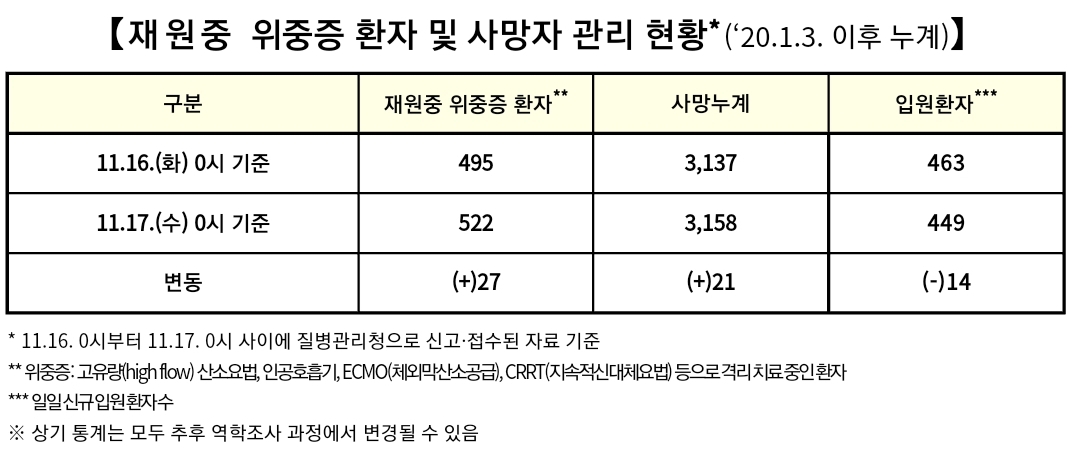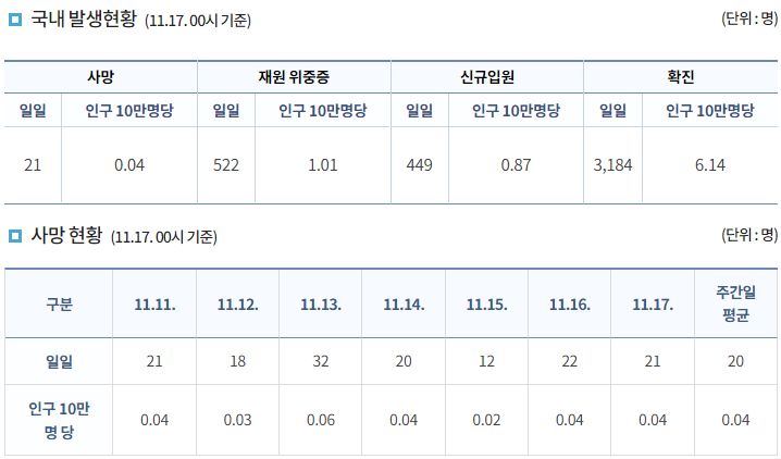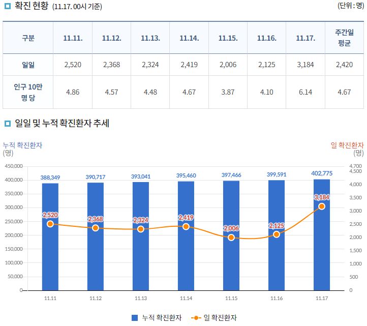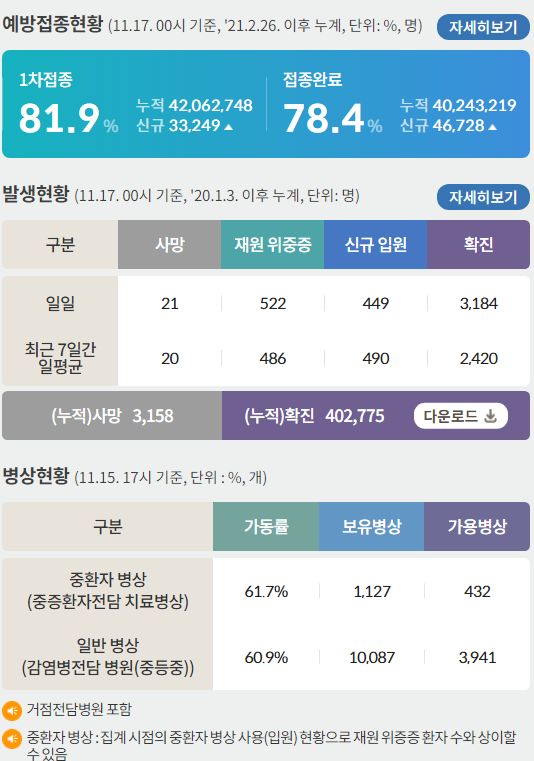 코로나19집계(2021.11.17. 0시기준): 3187명/:/ 중환자병상, 일반병상 여유는 각각 약 40% 본문