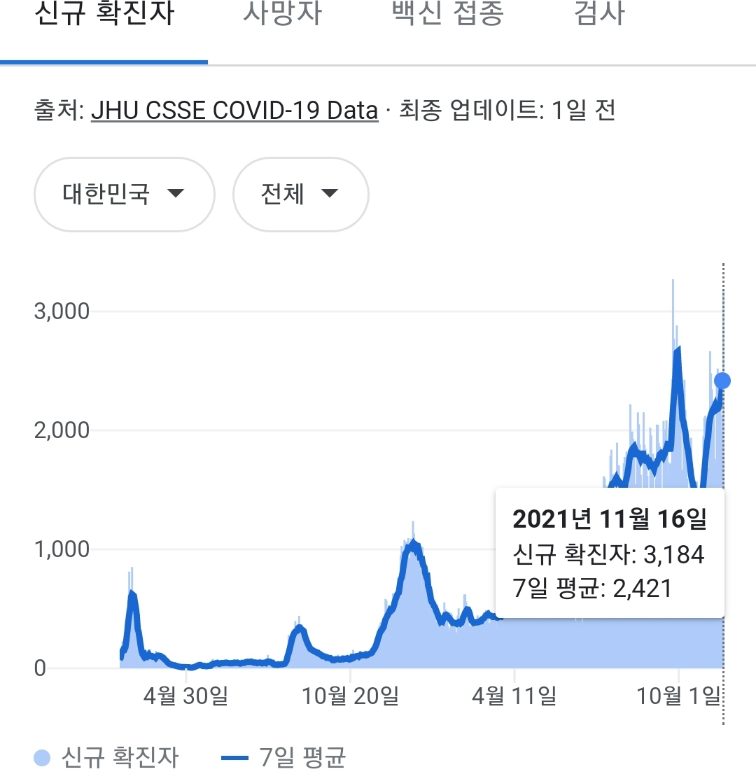 | 코로나19집계(2021.11.18. 0시기준): 3292명 (0) | 2021.11.18 |