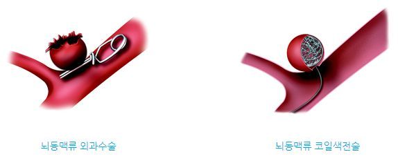 허벅지 대퇴동맥에서 뇌동맥류까지 카데터를 넣어 백금코일을 채워 그 부분을 막는 혈관 내 코일색전술.