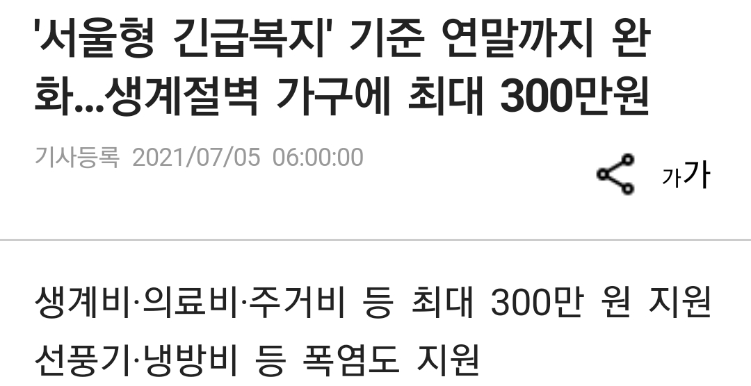 서울시, 서울형 긴급복지 지원기준 완화를 2021년 연말까지 연장(7월 기사) 본문