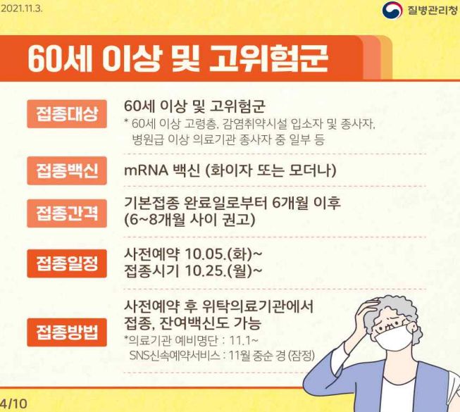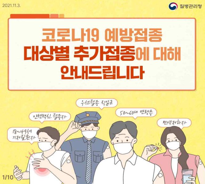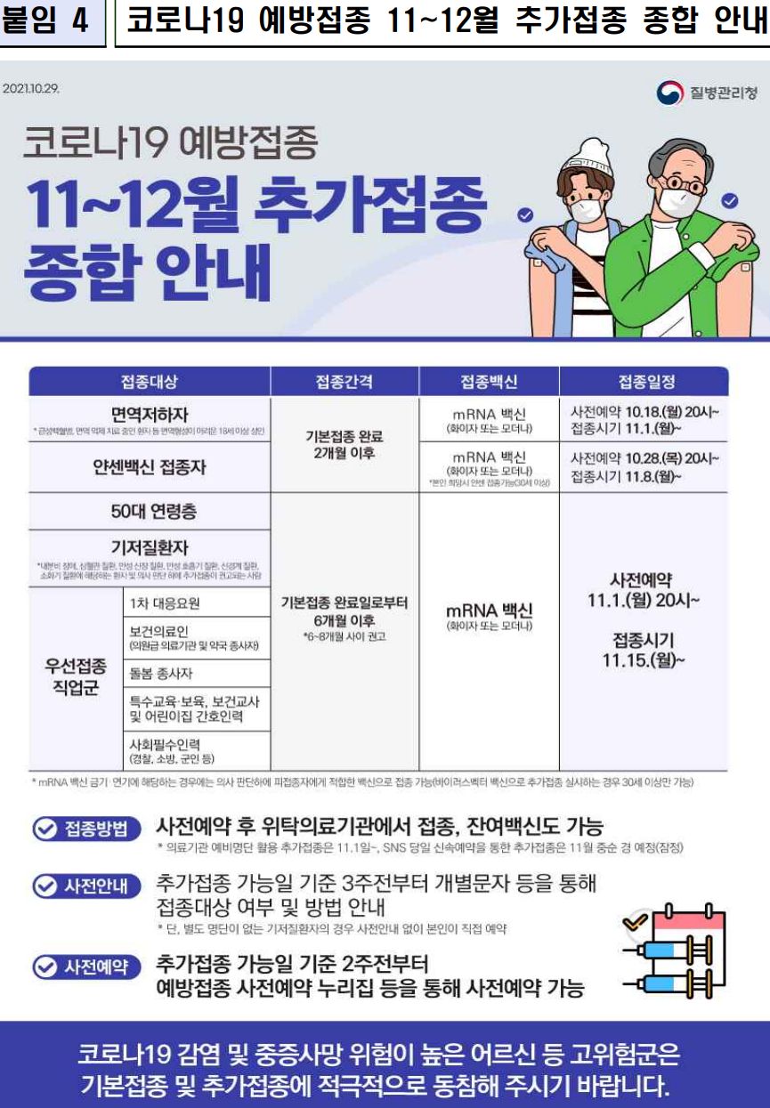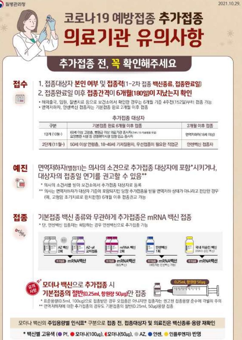 추가접종은 기본적으로 대상자에게 통보 문자가 가고, 시설종사자는 그 시설에서 일정을 잡아 안내를 하게 됩니다. 개인적으로 빨리 받겠다면 사전예약과 잔여백신사이트 이용 가능하다는 얘기가 있었습니다.