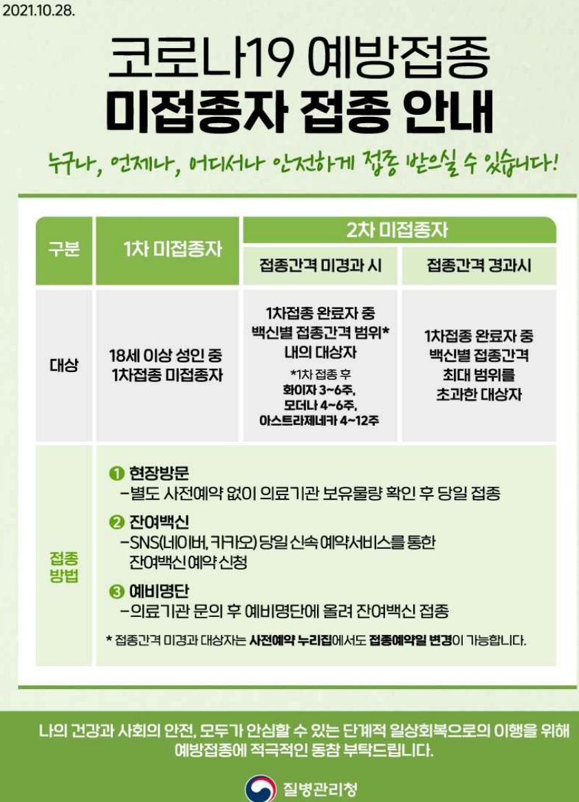 코로나19, 2021년 11~12월 예방접종과 추가접종(부스터샷) 등 (질병관리청, 2021.11월 하순)/:/ 백신 미접종자 접종 안내(잔여백신, 온라인예약, 현장방문 등) 본문