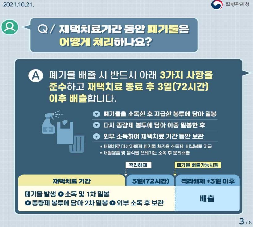 생활폐기물을 내버리러 문밖에 나가는 것도 금지. 지급되는 소독제를 사용해 처리하고 이중밀봉해 다용도실 등에 보관. 격리해제 후 배출.