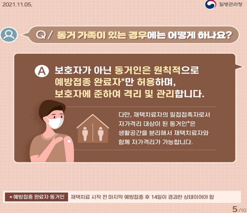 환자와 보호자/동거인은 전염을 막기 위해 실내마스크착용, 위생용품분리사용, (가능하면)화장실분리사용 등 해야 함.