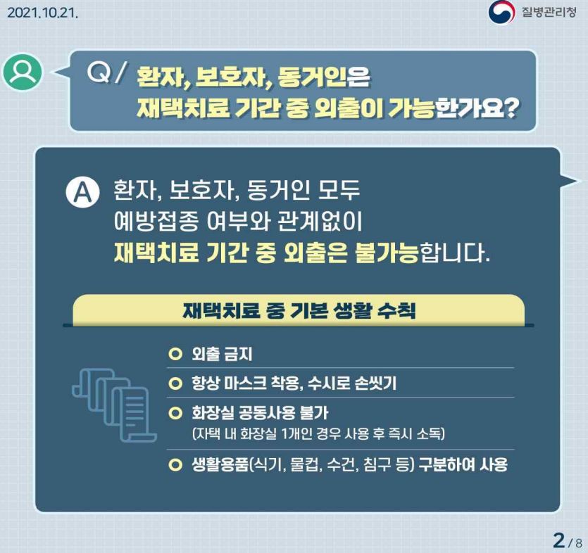 보호자는 재택치료기간동안 환자와 한집에서 격리생활해야 하고 외출 및 이동금지.