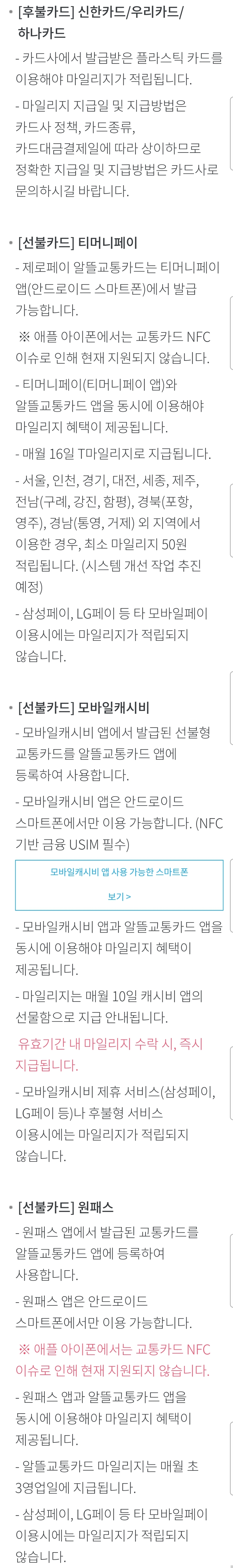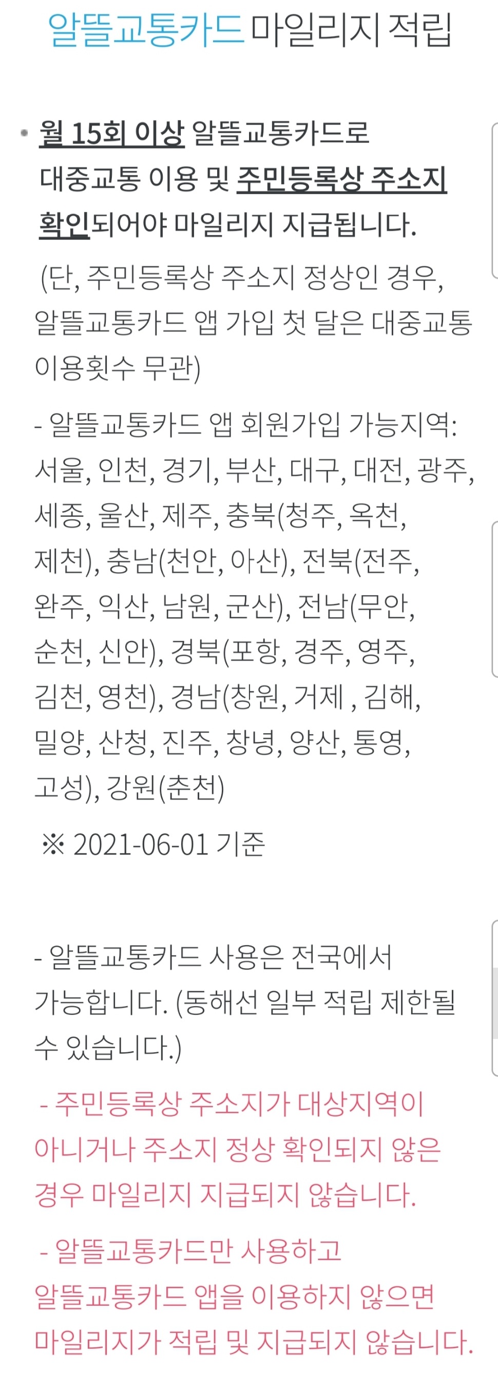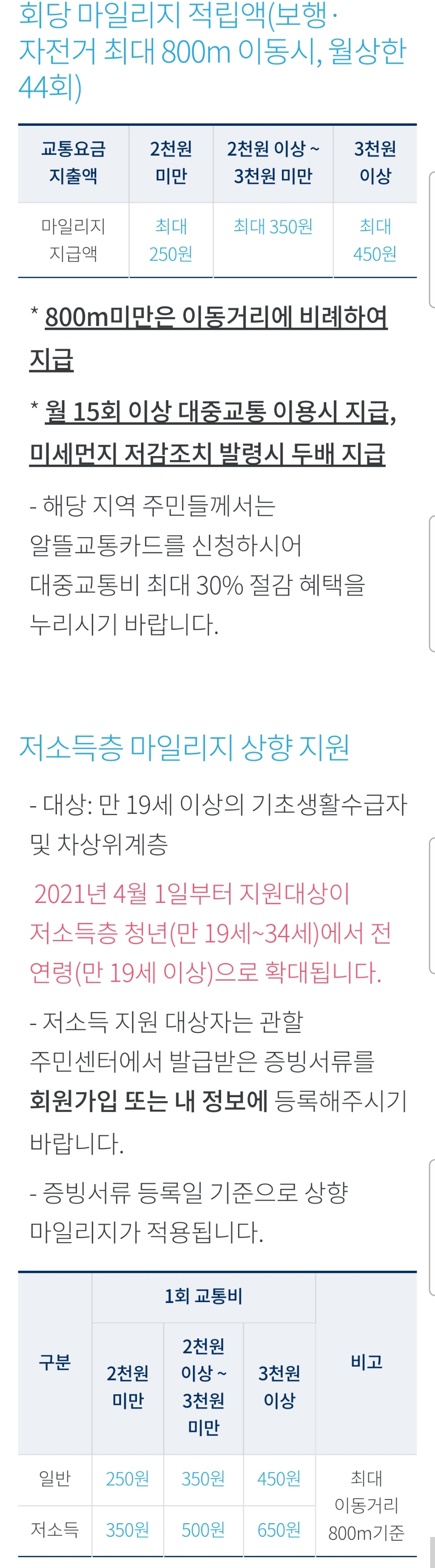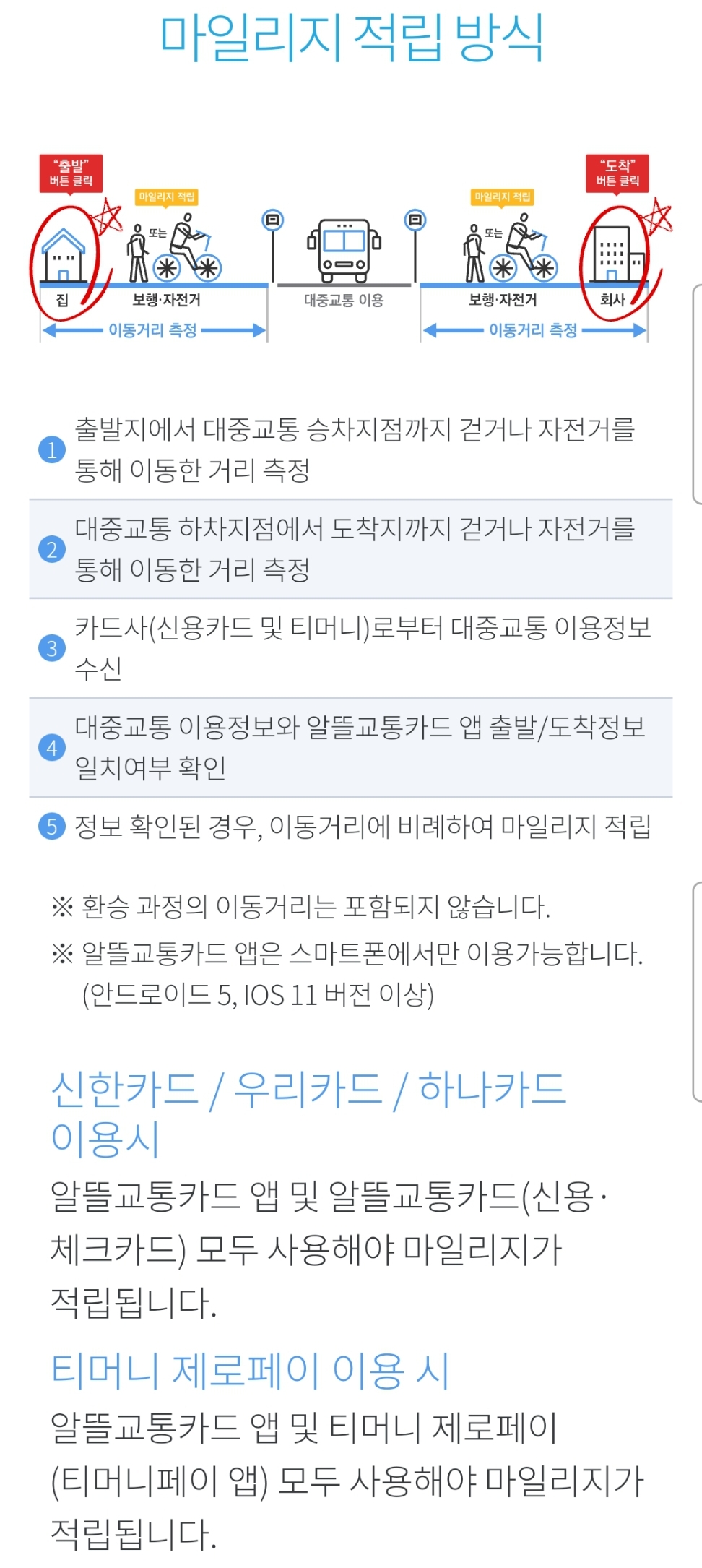 그리고 지자체 지원이 되기 때문인지 주민등록주소지의 지자체에서 사용한 부분만 마일리지 계산에 적용되며,1 앱설치와 카드 발급을 다 해야 적립하고 또 쓸 수 있다고 안내하고 있습니다.(아래 스크린샷 참조) 아래 광고에도 그렇죠? 마일리지적립에 이동거리를 반영 하므로 그 계산을 위해 승하차때 앱을 사용하라고 나옵니다.