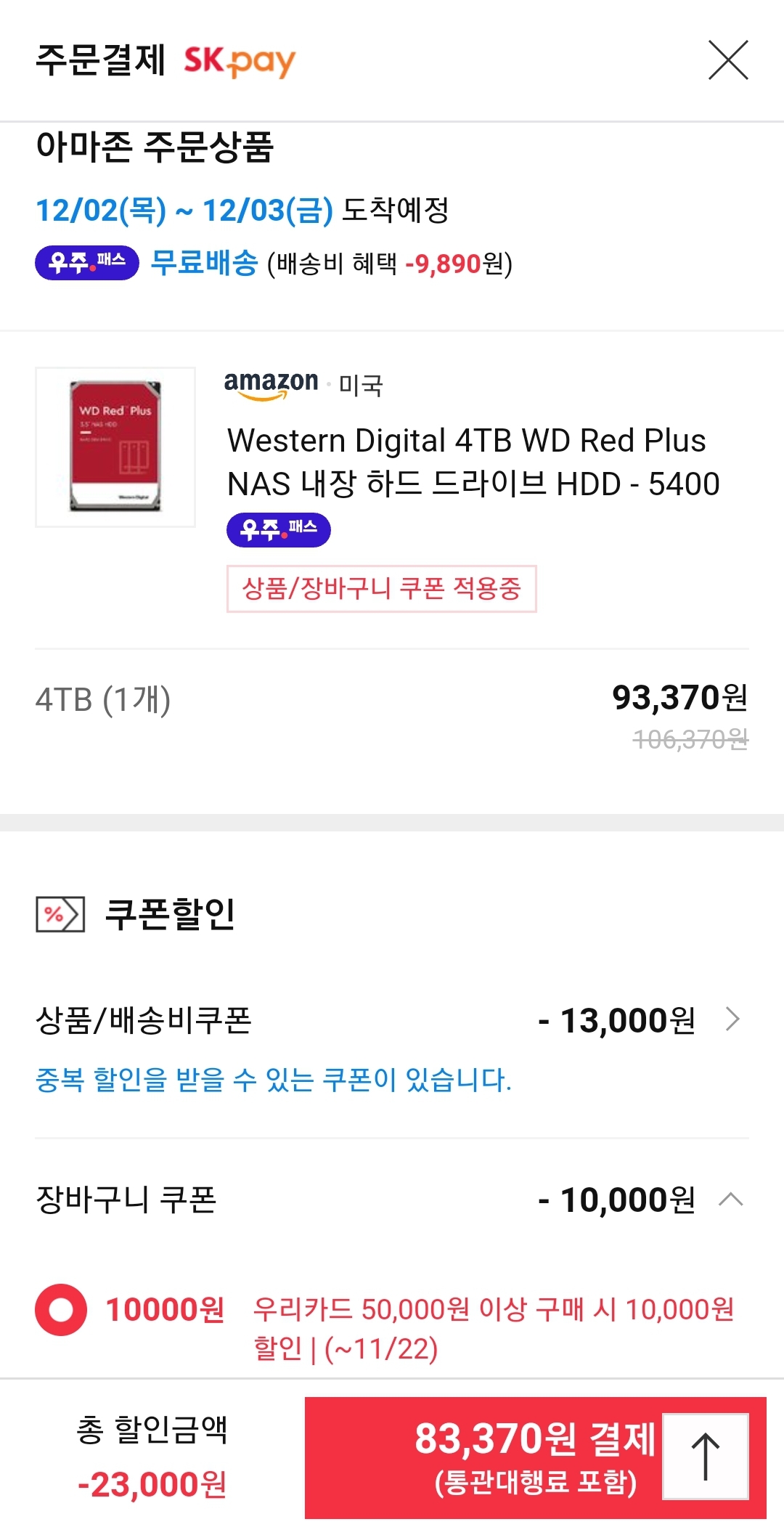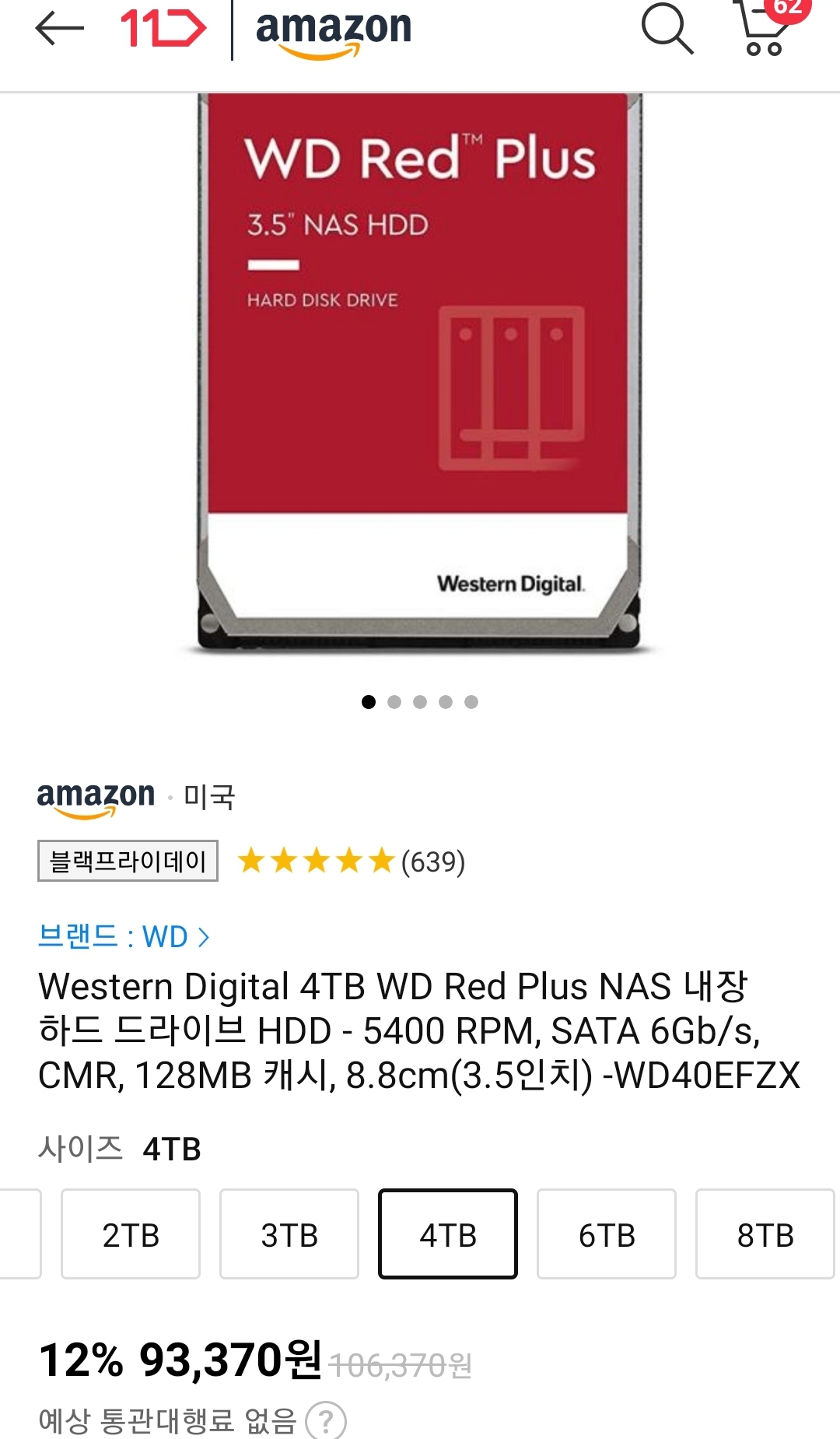 (11번가-아마존) WD 레드 플러스(CMR) 4TB HDD(9.3 → 8.8만원/일반, 8.3만원/우주패스) 본문