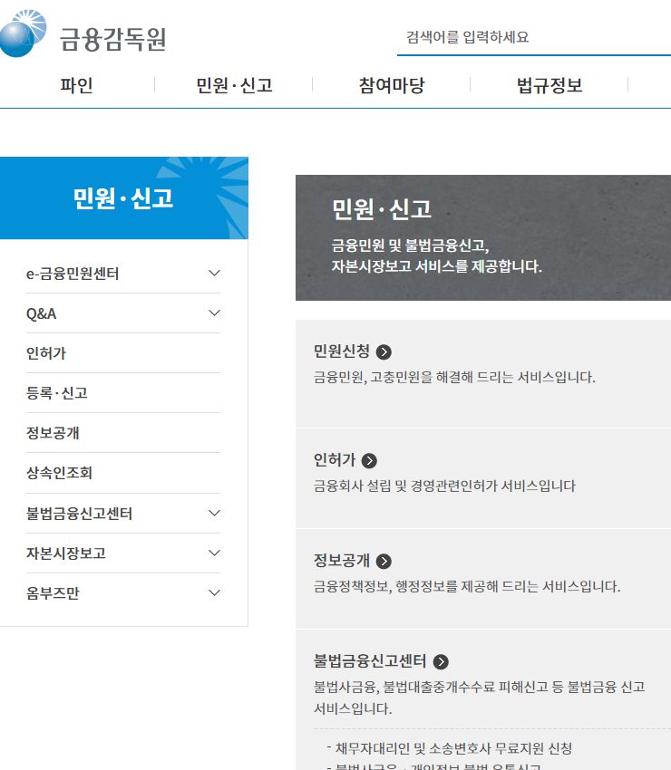 민원·신고 금융민원 및 불법금융신고, 자본시장보고 서비스를 제공합니다. 금융민원, 고충민원을 해결해 드리는 서비스입니다. 금융거래 등과 관련된 금융회사 사실확인이 필요없는 단순질의