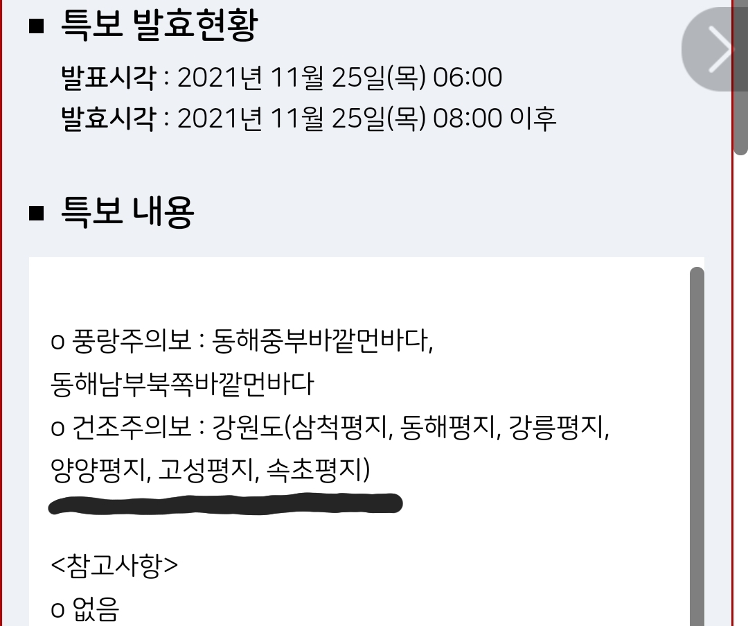 "건조주의보 : 강원도(삼척평지, 동해평지, 강릉평지, 양양평지, 고성평지, 속초평지)"