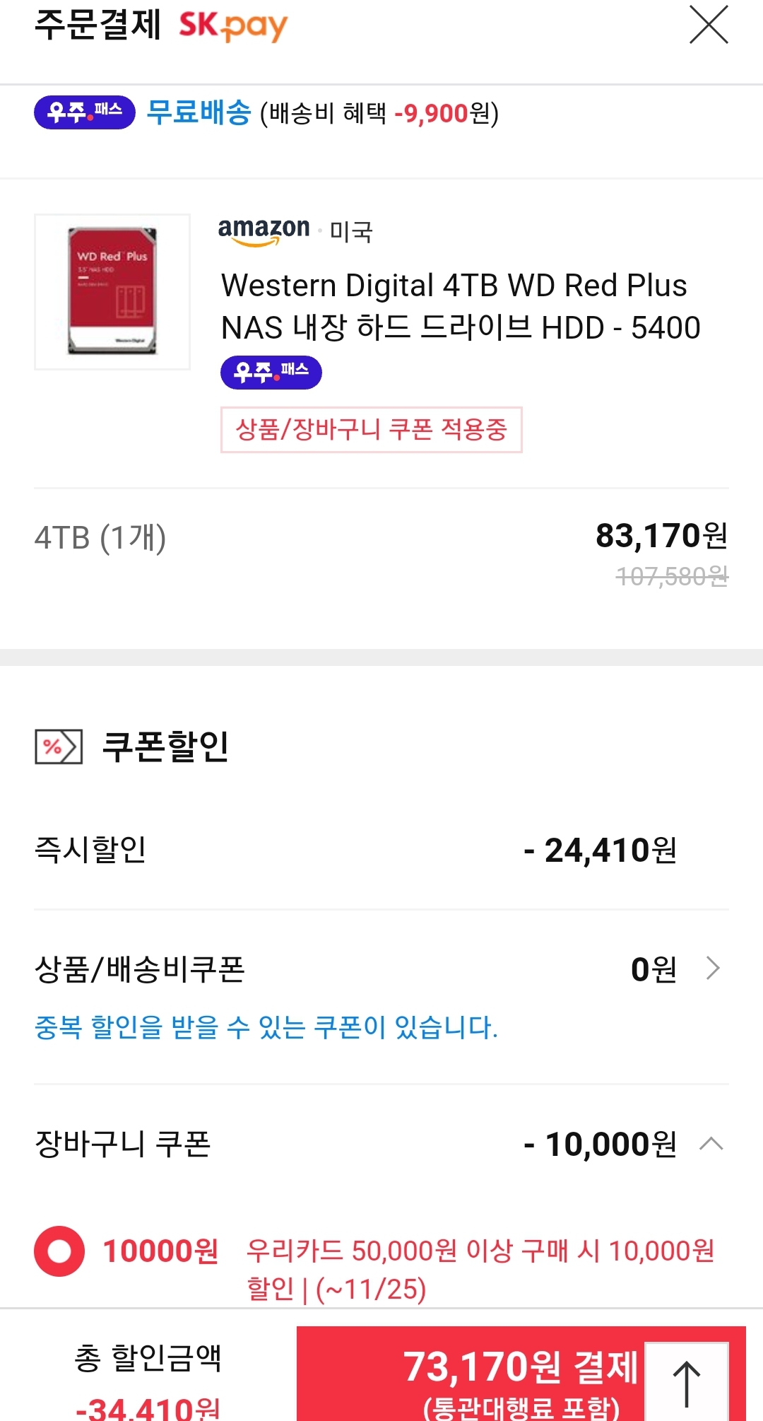 (11번가-아마존) WD 레드 플러스 NAS 4TB HDD (8.3만원→7.3만원/우주패스) 본문