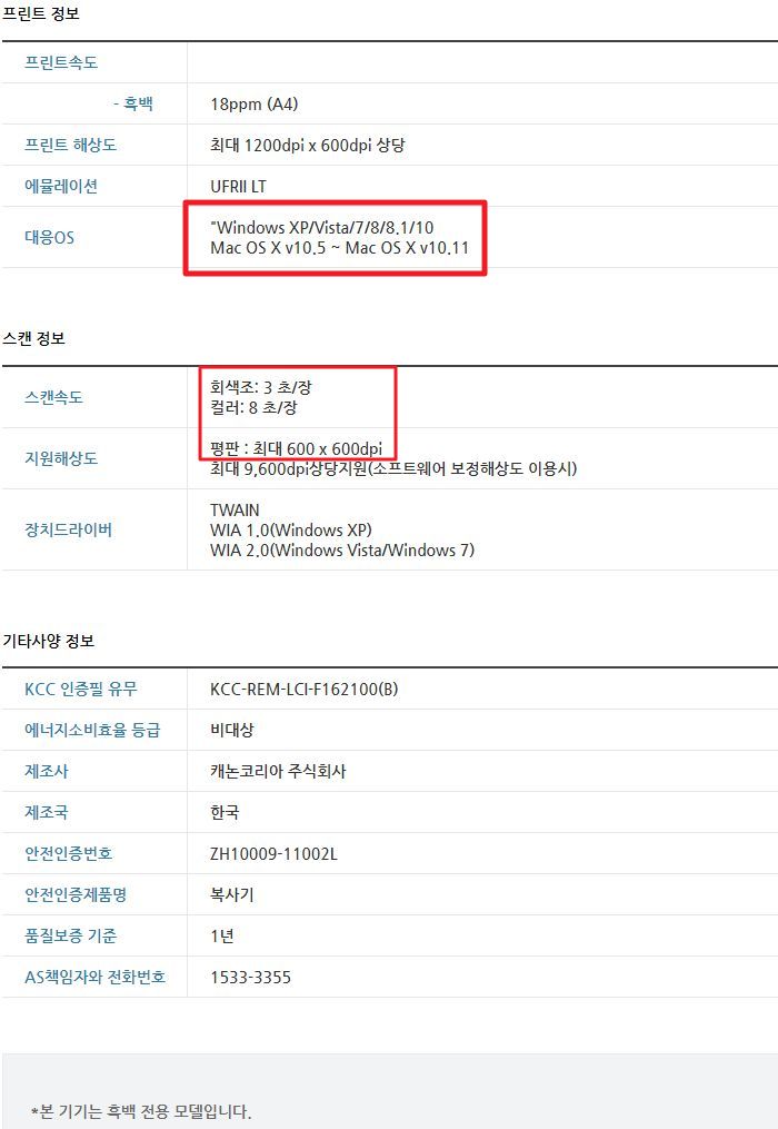 (추가: 사양표의 아래 부분을 보면, "윈도우 XP부터 윈도우 10까지 지원한다"고 나와있습니다. 각 버전의 32비트/64비트 지원과 윈도우11지원은 잘 모르겠는데, 공홈의 드라이버 다운로드 페이지나 이 기계를 써본 분들 사용기를 봐야겠군요. 맥OS는 10.5~10.11까지 지원한다고 합니다. 요즘은 OS버전이 바뀌면 구버전OS용 드라이버를 깔아 대충 쓰는 방법이 통하지 않을 수 있기 때문에, 이런 부분은 잘 봐야 합니다.