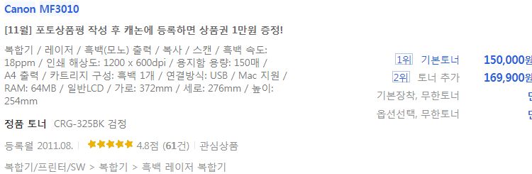| 캐논 MF3010 흑백레이저 복합기(~11만원) (0) | 2021.12.23 |