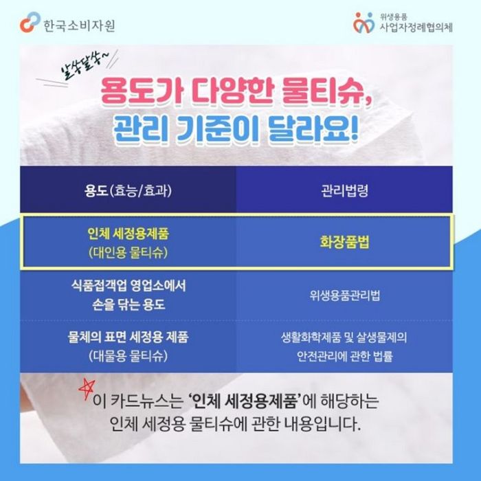 "(2014년) 현재 국내에서 판매되는 물휴지(티슈)는 인체 청결용과 구강 청결용(의약외품) 제품으로 나뉘어 있다. 다만, 음식점 등에서 제공되는 제품은 「공중위생관리법」에 따라 위생관리용품으로 구분된다. (......) 인체 청결용 물휴지가 화장품으로 관리되면 사용원료 기준을 준수해야 하고 품질관리기준 및 제조판매 후 안전기준을 적용받아 품질검사 이후 적합된 제품 만 판매되며, 부작용 보고가 의무화된다. - 2014년 아래 기사"