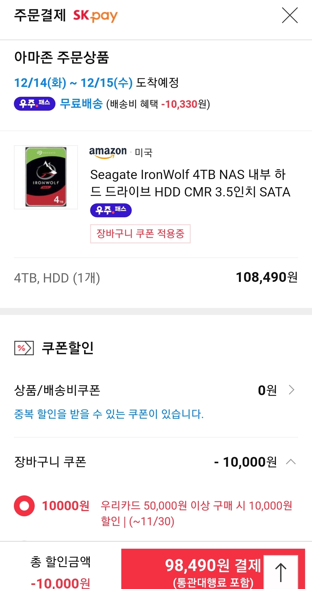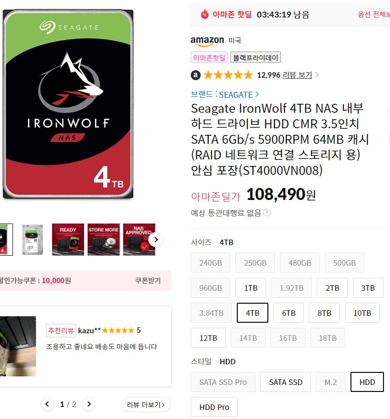 (11번가-아마존) 시게이트 아이언울프NAS 4TB HDD(CMR) (10.8만원 -> 9.8만원/우주패스) 본문