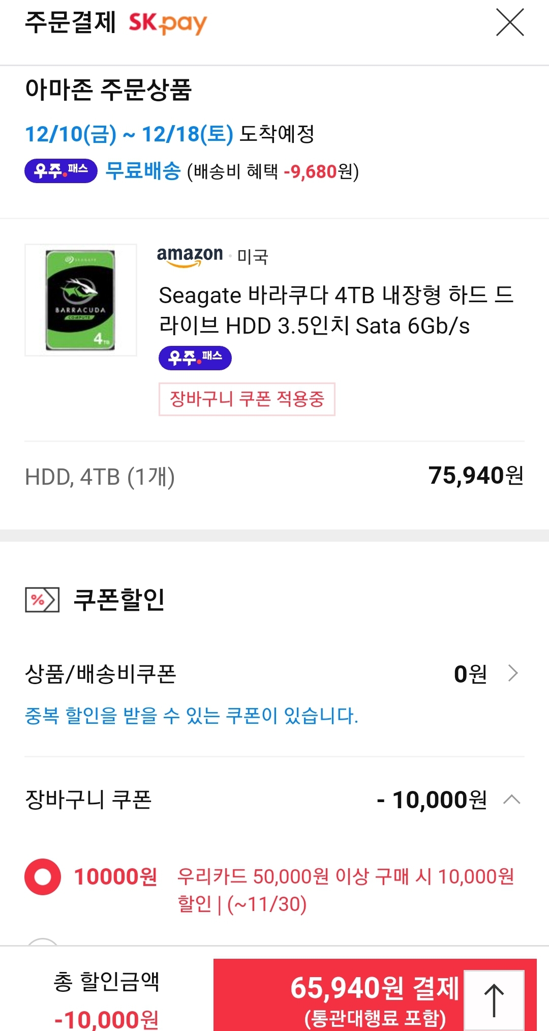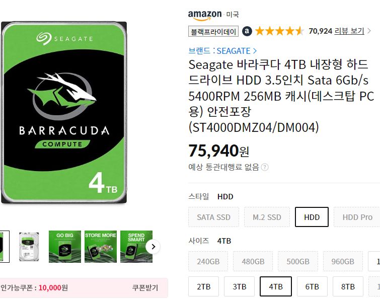 (11번가-아마존) 시게이트 바라쿠다 4TB 하드디스크(SMR) (7.6만원 → 6.6만원/우주패스) 본문