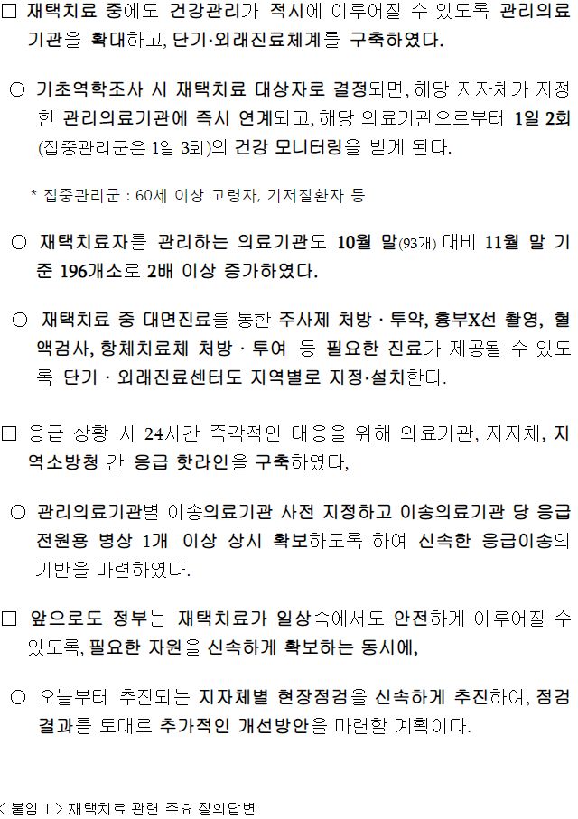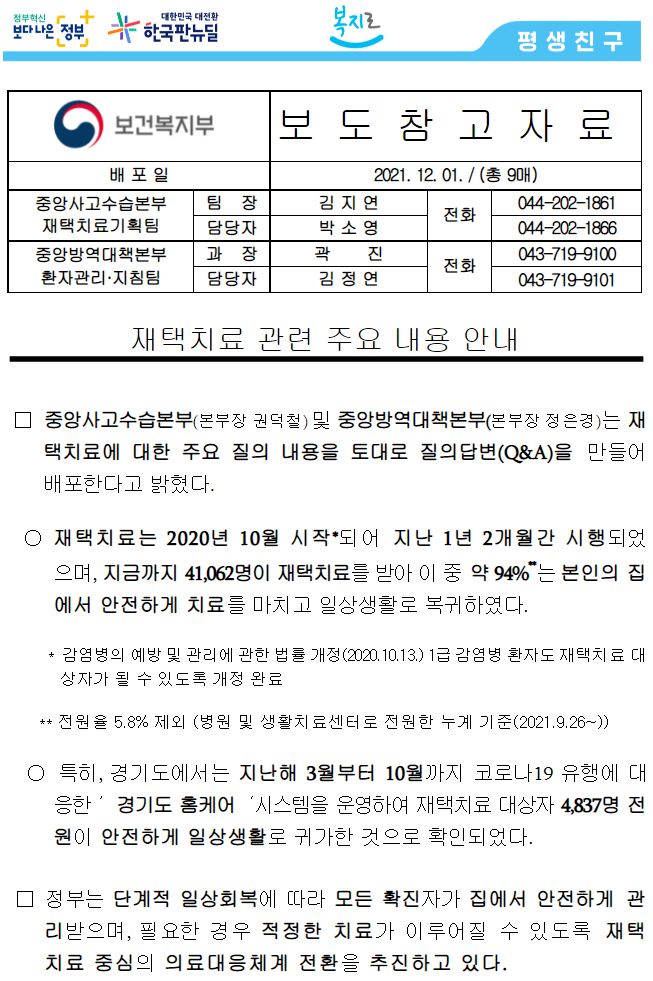 | 코로나19환자 재택치료 방침, 정부 추가 보도자료(2021.12.1) (0) | 2021.12.01 |
