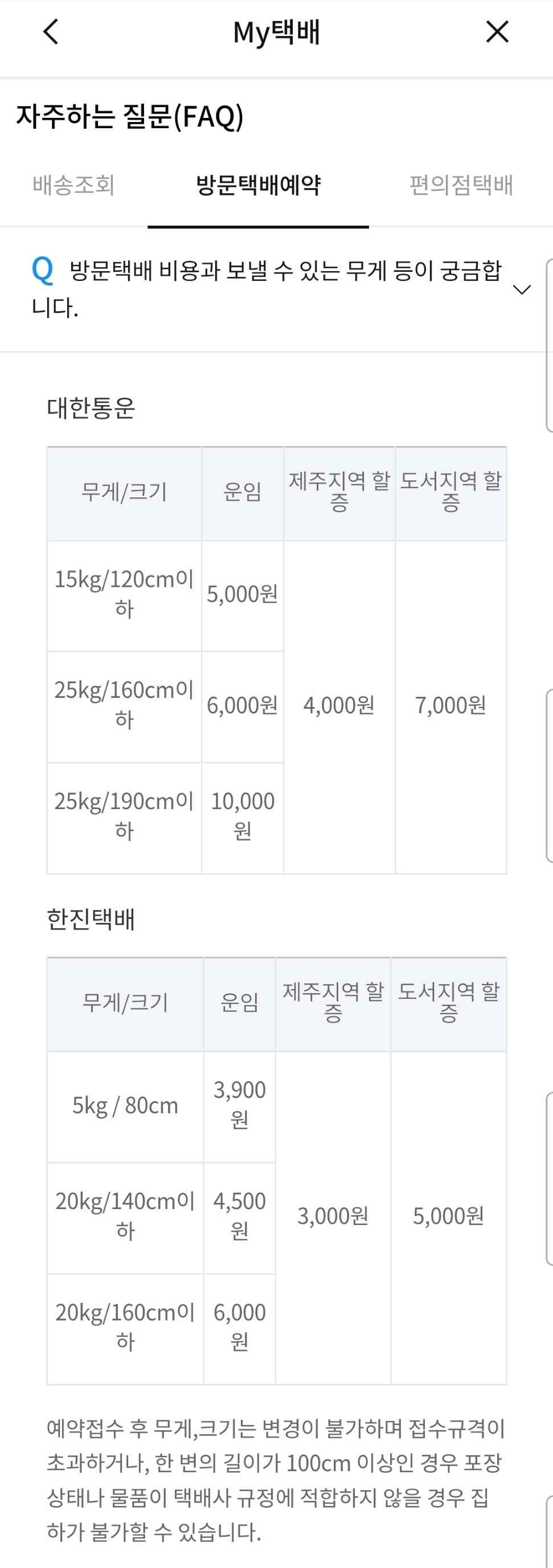 방문택배는 대한통운과 한진택배.