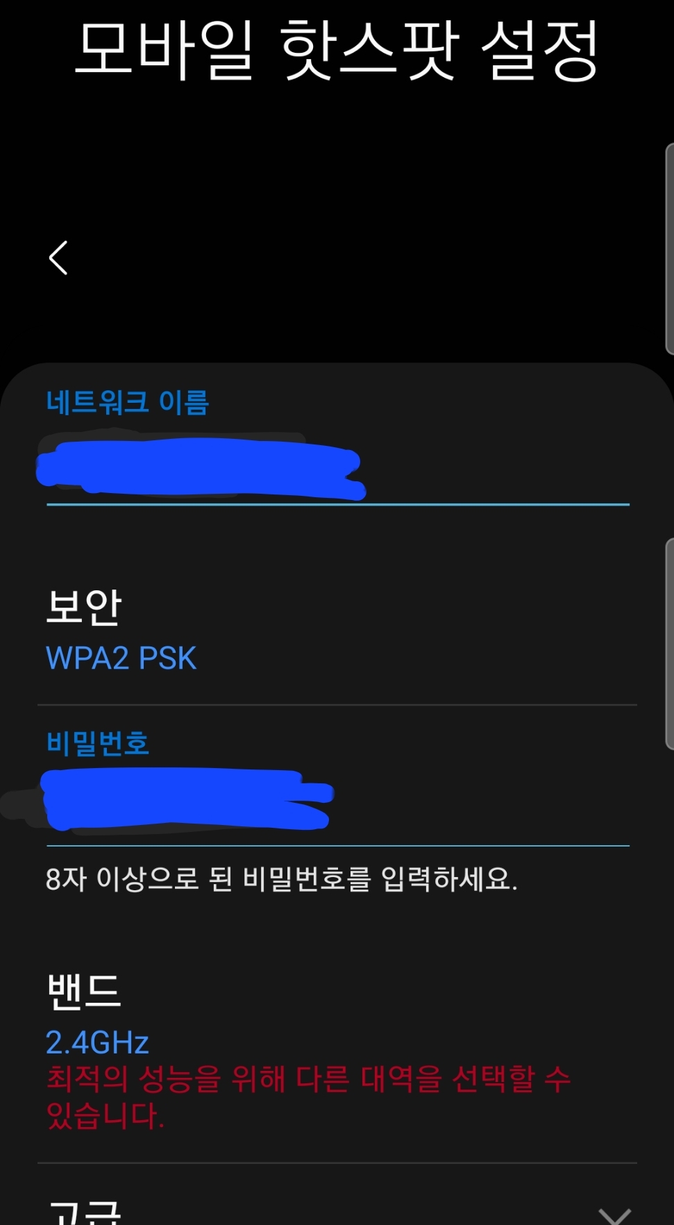 iptime인터넷공유기는 아니니까, 이 전화기 모바일핫스팟은 SSID는 1개입니다.