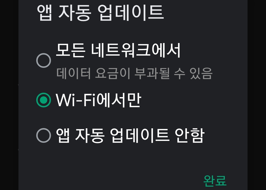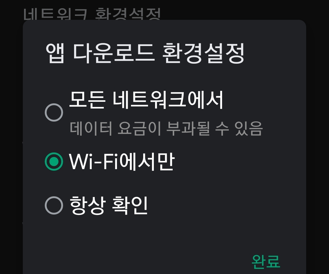 앱 다운로드 환경설정을 wifi일 때만 하게 두고 잊어버리면 가끔 당황합니다. ^^; 그런데 1Mbps QoS나 400kbps QoS구간일 때는 느리기 때문에 앱설치는 하지 않는 게 좋을 때도 있어요.