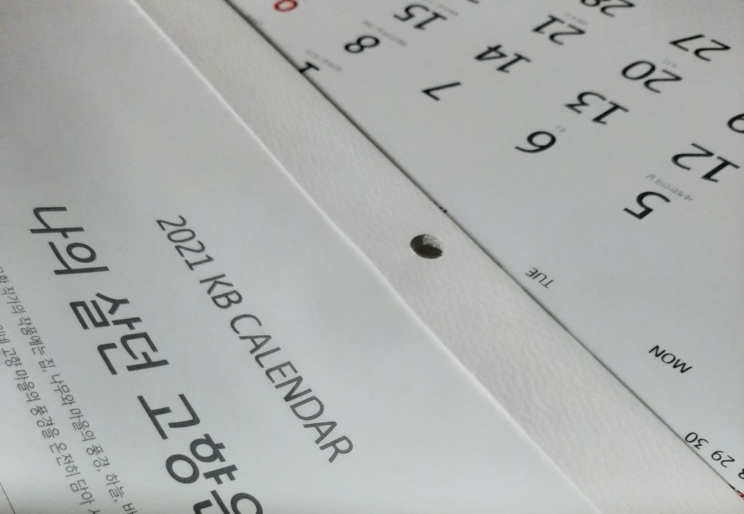 지역 소비자금융기관에서 구할 수 있는 제일 큰 사이즈에 얇은 종이로 된, 글씨만 나온 달력말이죠. ^^ 실용적입니다. 글씨가 커서 시력이 전같지 않은 어르신들도 좋아하시고, 음력도 표시돼있고, 메모할 빈 자리도 크고.
