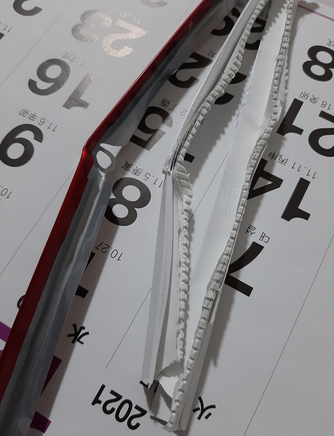 이 달력은 종이질이 좋은 코팅재질이지만, 그냥 복사용지나 전지 재질이라도 이 부분만 저렇게 만들어붙일 수 있을 것 같았습니다. 그런데, 습기있는 장소에 걸면 1년간 버틸지는 잘 모르겠네요. 모나미153볼펜만한 원통형 심지를 쓰면 튼튼하겠지만 그건 쇠보다 비싸지 않을지 모르겠습니다.