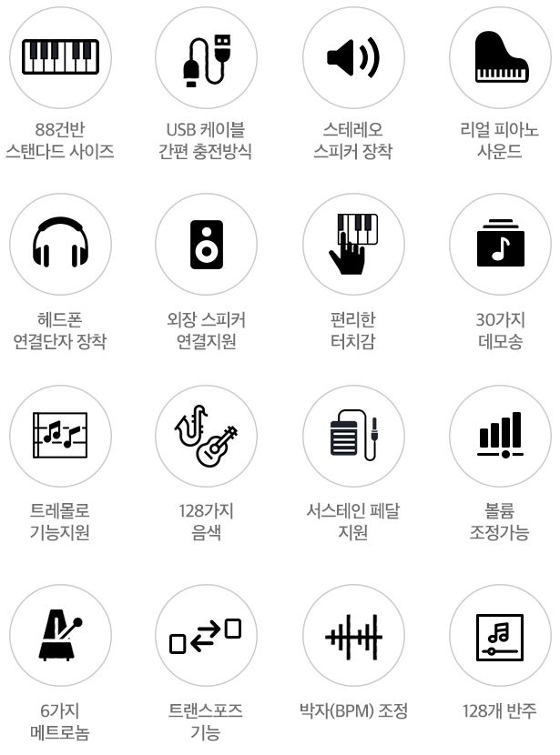 내장 128음원과 메트로놈, 스피커, 3.5파이 헤드폰단자로 키보드 단독으로 건반악기로 쓸 수 있으면서, USB포트 미디연결해 컴퓨터작업가능.