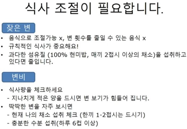 수술직후 통증때문에 진통제를 쓸 수 있는데, 진통제의 부작용 중 하나가 변비. 그런데 대장절제수술받은 환자들은 설사나니까 진통제먹으면 변이 좋아진다고 말할 수 있다. 하지만 진통제 상용은 좋은 처방이 아니므로 이 목적으로는 안 된다.