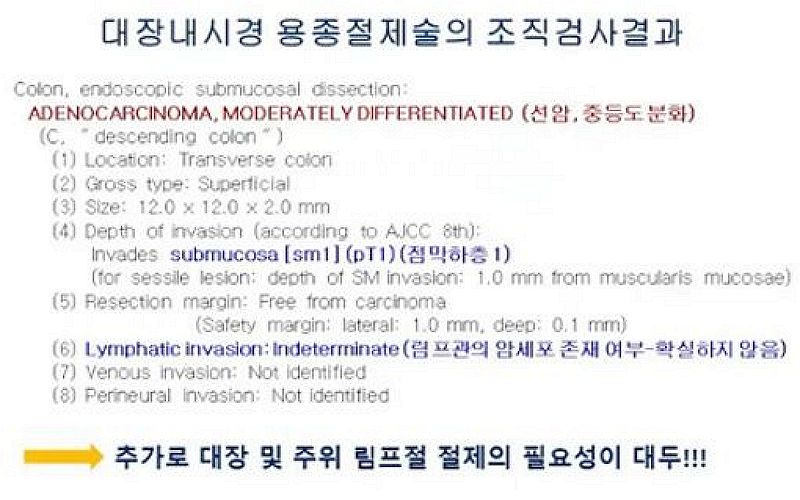 어떤 내시경검사로 용종절제한 다음 그 조직의 조직검사결과지 예시. 전이의심이 조금 있었지만 환자가 다시 병원에 왔을 때는 이미 조직은 내시경으로 확인할 수 없을 만큼 절제부위가 완전회복된 다음이라, 준비과정이 필요했다고. 조직검사결과가 나오고 암진단이 나면 바로 다음 치료를 하자.