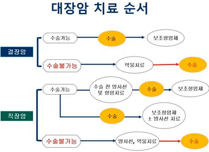 그 다음은 결장암과 직장암의 병기에 따라 고려하는 일반적인 치료 이야기.