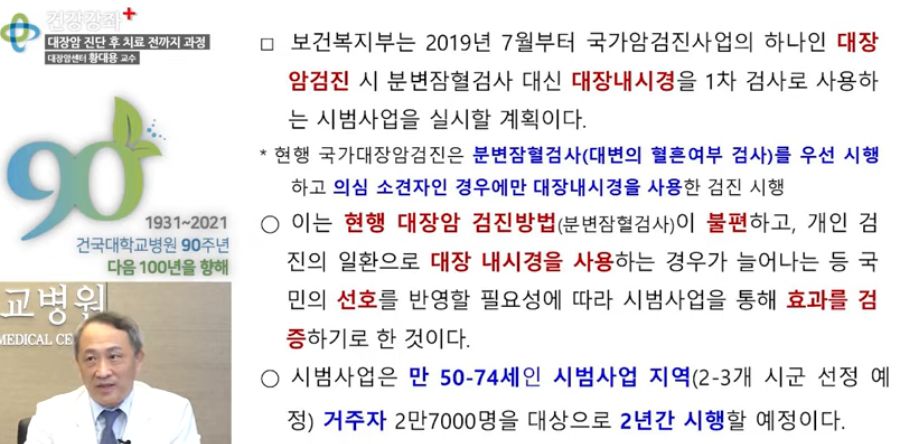 그리고 대장암이 있어도 20~30%만 대변검사에서 양성이 나오기 때문에, 아예 그냥 대장내시경을 1차검사로 하는 시범사업을 2021년까지 진행 중. (아마, 내시경으로 바꾸면 매년은 아니고 몇 년마다 하는 게 되겠지만 대장암은 진행이 느리다니까)