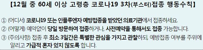 | 정부, 코로나19 3차접종(부스터샷)간격 2~3개월로 단축(2021.12.9. 보도자료) 등/:/ 병상확보상황과 재택치료집계/:/ 방역패스 적용시설, 미적용시설 (0) | 2021.12.10 |