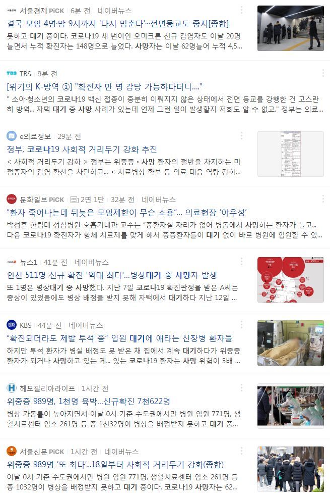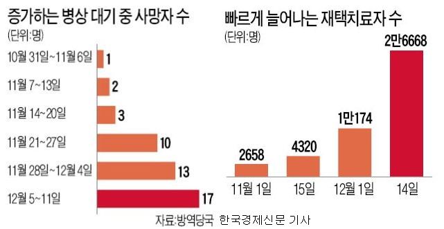 기사내용 요약 11월 중순부터 수도권 중환자실 가동률 75% 넘어 병상 대기 중 사망, 위중증 환자, 확진자 수 등 급증 정부는 위중증화율 오판…행정명령에도 병상 부족 "한 달 끌어 피해 막심…생
