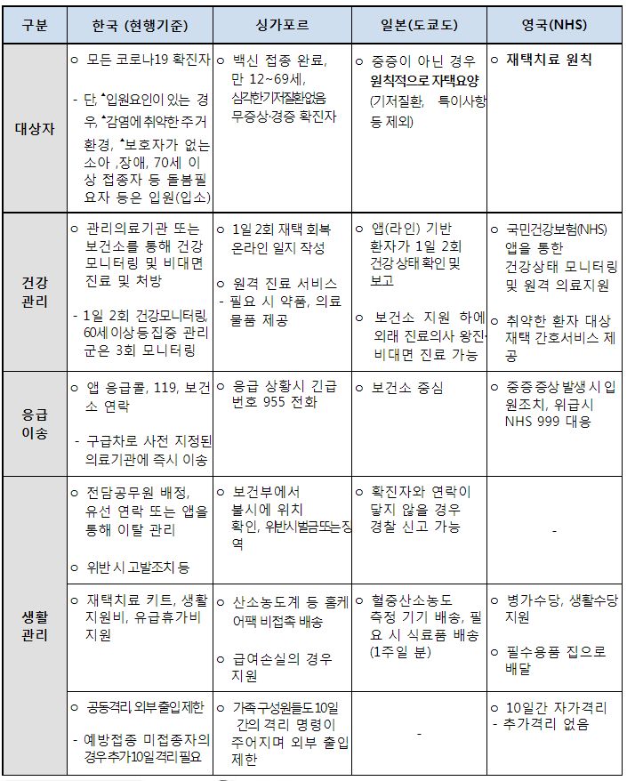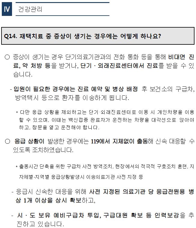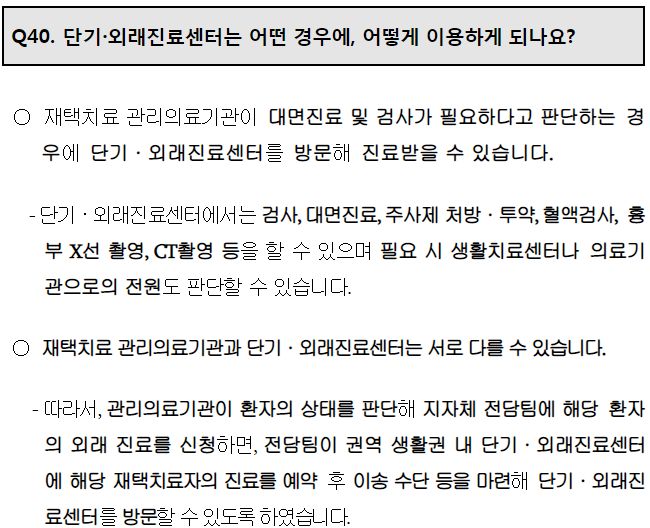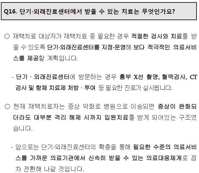 ㅡ 비대면 건강모니터링, 증상이 악화되면 의사판단에 따라 외래진료센터나 단기진료센터로 이송치료