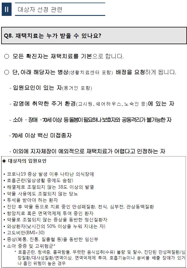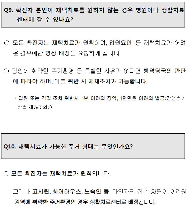 ㅡ 코로나19확진자가 거주하는 집이 생활수칙을 준수할 수 있는 조건이라야 재택치료대상. 기숙사, 고시원, 하숙, 셰어하우스나 그에 준하는 공동생활환경이라면 확진자 재택치료불가, 입소대상. (한 세대 안에서 확진자와 동거하는 가족은 재택치료기간이 끝날 때까지 같이 격리되고 외출 금지)