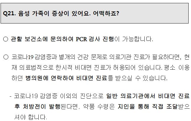 음성인 가족이 코로나19와 무관한 질병으로 병원외래진료를 받을 필요가 있는 경우 한시적으로 비대면진료가능. 그 음성인 가족의 비대면진료 후 처방약이 있는 경우에는, 지인에게 부탁해 대리수령 후 집 현관앞에 두거나, 확진자가 아닌 동거가족이 외출허가를 받아(아래 재택치료생활문답 참조) 대리수령해 귀가하는 식으로 전달받야 한다는 듯.