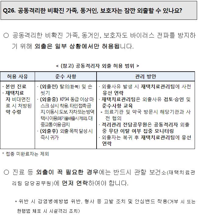 확진자와 같이 격리생화하는 비확진 가족/보호자/동거인의 외출이 허용되는 경우.
