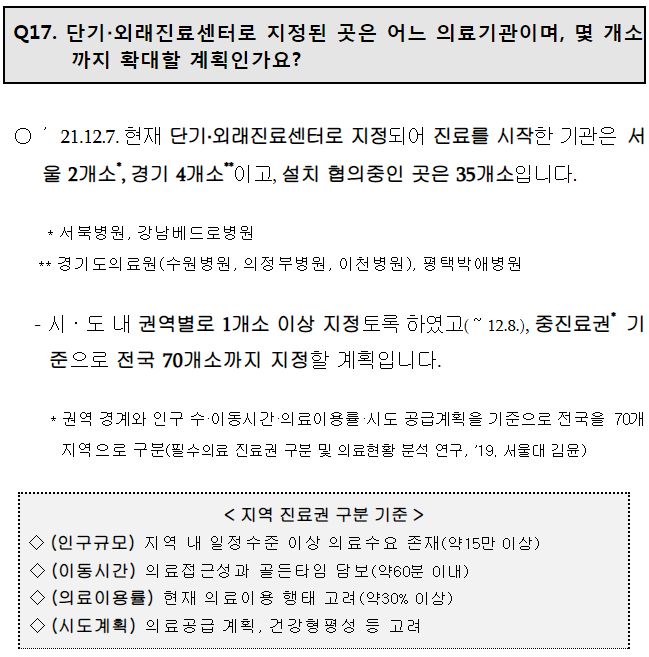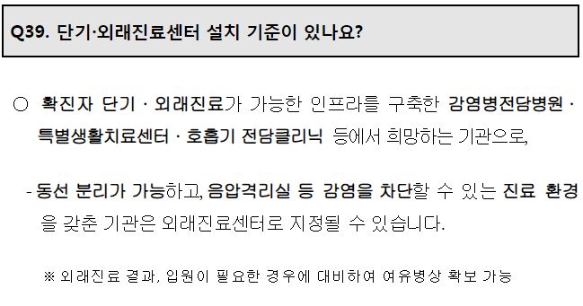 지정된 단기/외래진료센터는 병원급. (항체치료제도 병원급에서 의원급까지 처방가능하게 바뀔 것이라는 얘기를 본 적 있는데 확인필요)