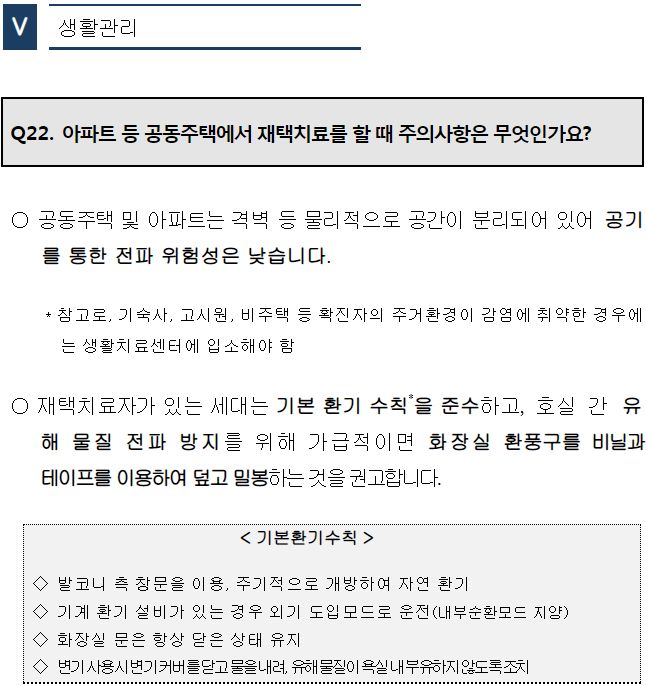 ㅡ 재택치료자가 있는 세대의 환기문제는 주택환기수칙 포스터나 아래 표를 참조.