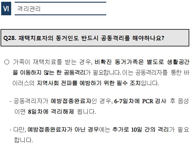 ㅡ "예방접종완료자가 아닌 경우 추가로 10일간 격리 필요." (이건 무슨 뜻일까요? 혹시, 재택치료가 끝난 뒤 이번에는 재택치료자가 아닌 공동격리자가 +10일간 자가격리란 말인가요? 이 부분은 아래에 따로 문답이 있습니다. 재택치료 첫 7일간의 건강모니터링이 끝나고 +8일째부터 재택치료자가 +3일 자가격리(해서 총 7+3=10일 재택치료)로 바뀌는 날부터 접종완료가 아닌 공동격리자는 +10일간 추가 자가격리)