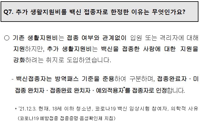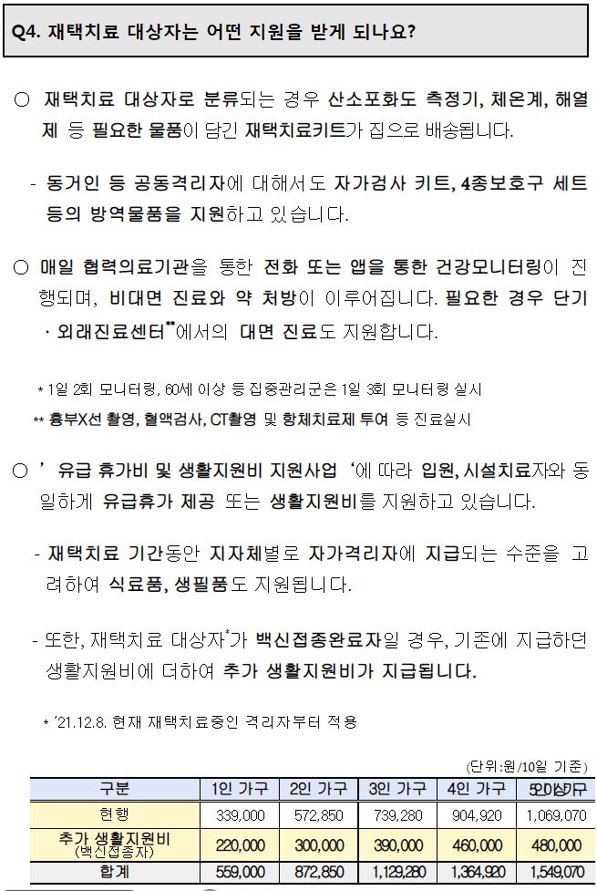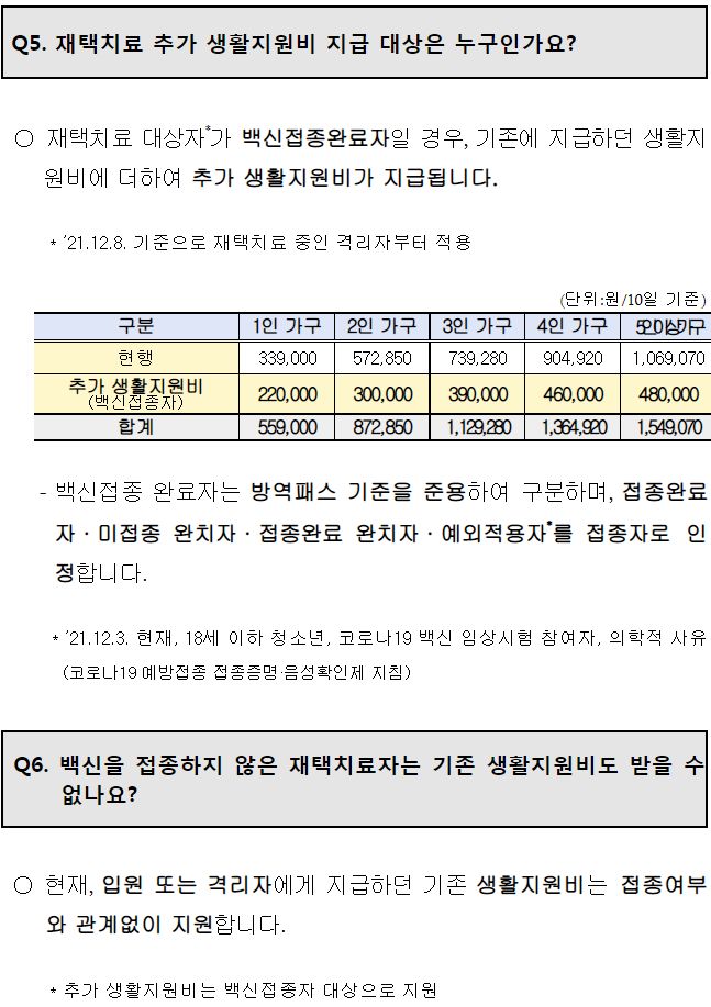 ㅡ 10일 재택치료기간기준 아래 표와 같은 소정의 생활지원비를 모든 대상자에게 지급. 그리고 백신접종완료자 인센티브로 추가 생활지원비 지급(12월 8일기준 격리자부터).