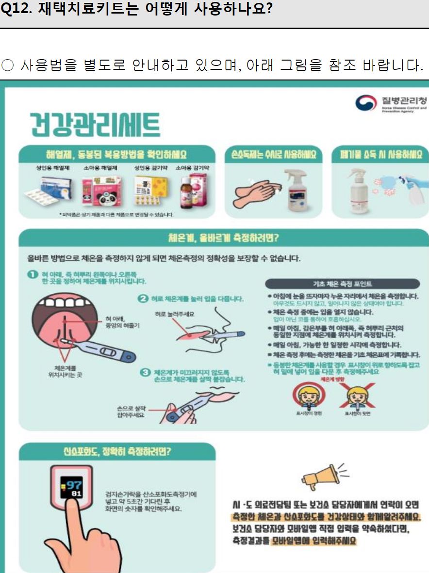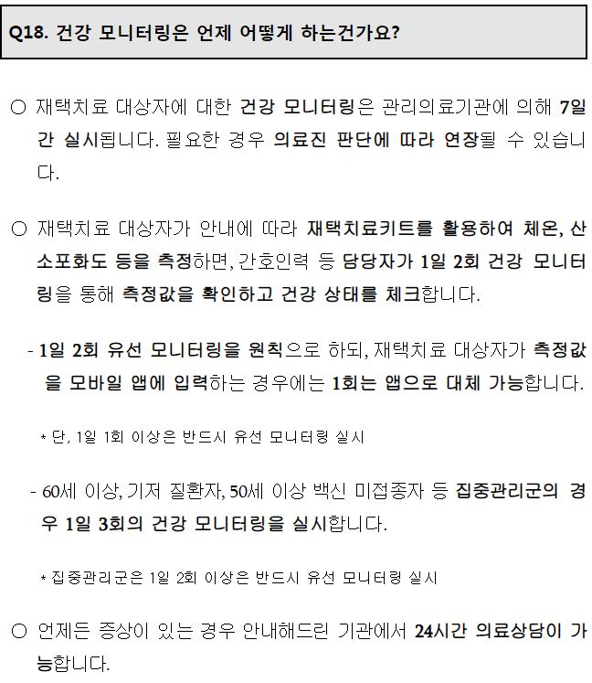 건강모니터링은 1일 2회 비대면(유선)이 기본인데, 재택치료앱을 사용하는 경우 1회는 앱으로 대체가능. 하루 한 번은 반드시 음성통화로 확인.