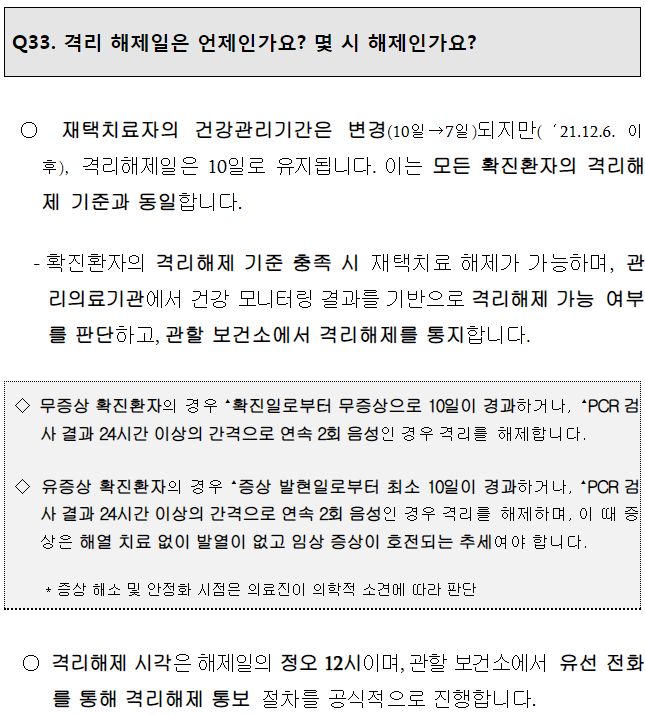 ㅡ 무증상 확진환자는 확진일로부터 무증상 10일 경과하거나, PCR검사시 24시간 이상 간격으로 연속 2회 검사 결과가 모두 음성인 경우 격리해제.