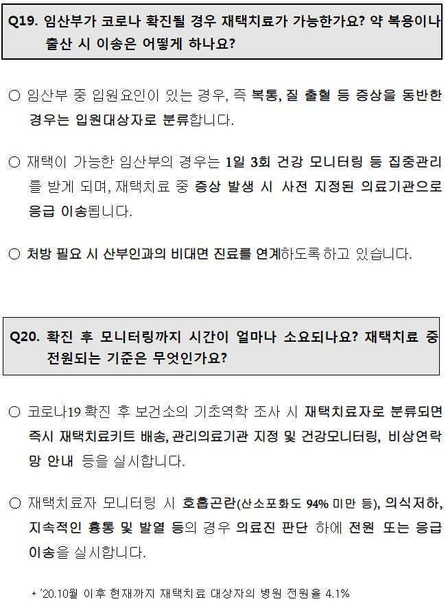 재택치료중인 임산부는 건강모니터링 1일 3회 연락. 코로나19나 임신관련 증상발생시 지정의료기관으로 응급이송.