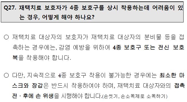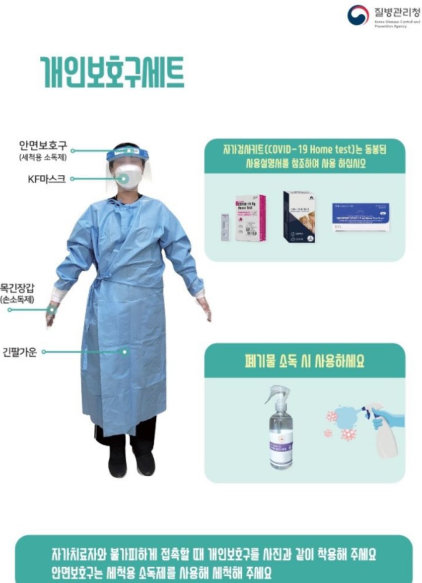 재택치료시 동거하는 보호자는, 환자와 접촉할 때, 재택치료키트에 포함해 지급되는 4종 보호구(KF마스크/비닐장갑/페이스실드/긴팔가운을 착용하도록 권장. 접촉 후 손소독제 사용/손씻기.