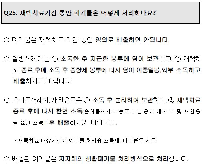 ㅡ 생활쓰레기를 버리려고 집밖으로 나가면 안 됨. 지정된 방식으로 소독해 지급된 봉투에 모아 밀봉 보관해야 한다. (겨울이니 그나마 다행이네) 치료기간이 끝난 다음 지정된 방식으로 포장해 배출.