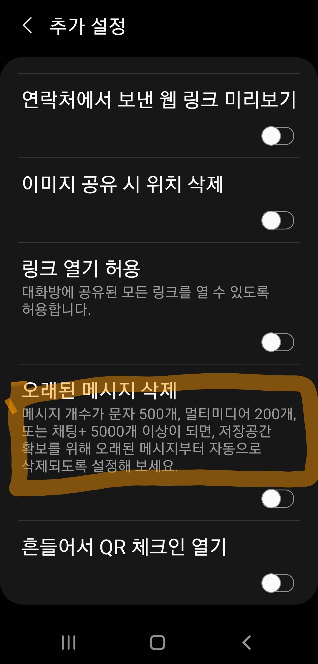 내부저장소 16기가때나, 64기가 이상인 지금이나 똑같은 옵션이 있는데, 바로 "오래된 메시지 삭제"다.